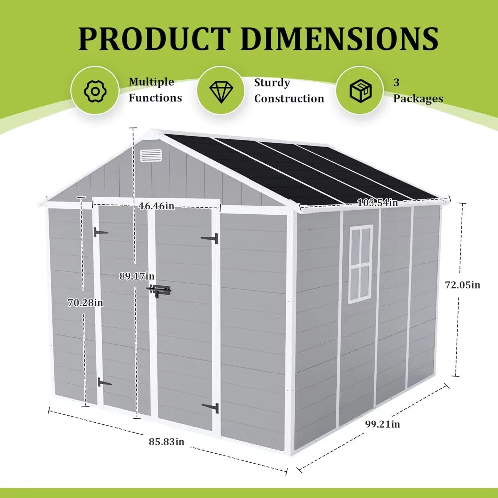 - Large 8×8 FT Outdoor Storage: This spacious resin shed (85.83″L x 99.21″W x 89.17″H) provides ample room for storing patio furniture, garden tools, and more, keeping your outdoor space organized.